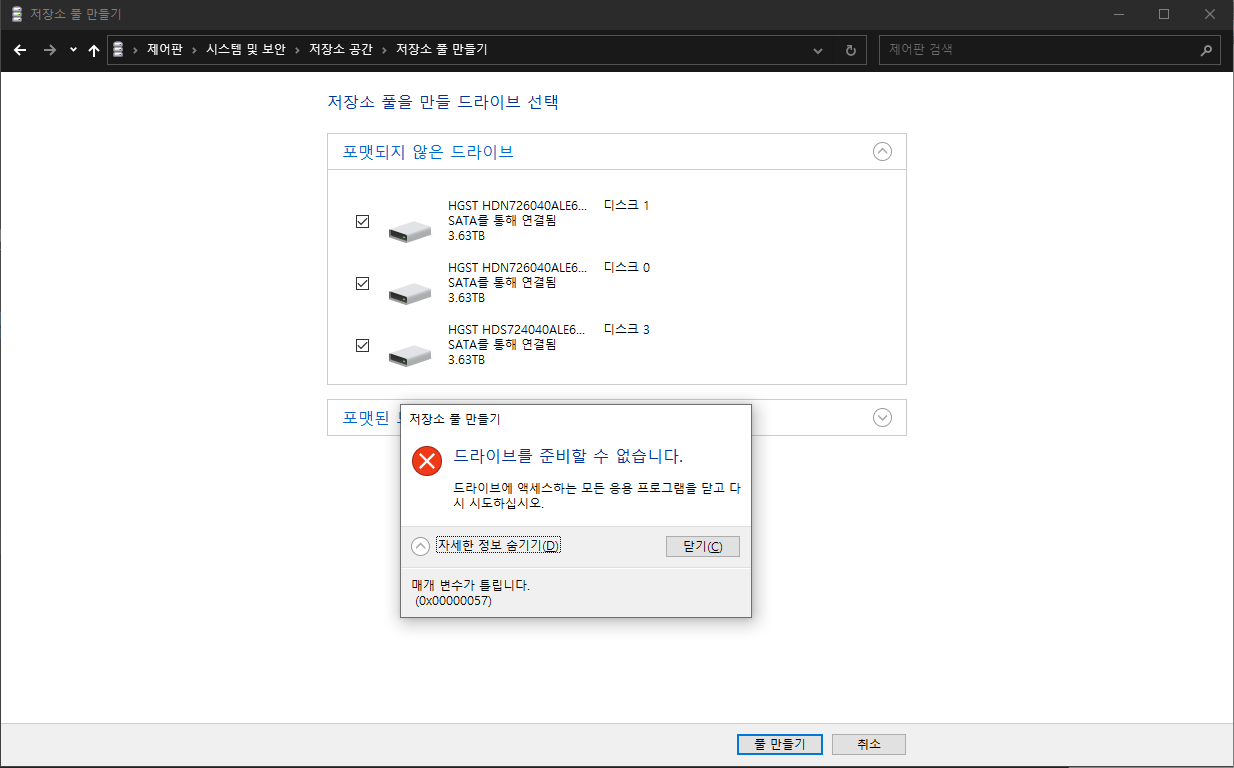 디스크 관리(diskmgmt.msc)에서 RAID 5 생성이 비활성화 되어있거나 저장소 풀 만들기에서 매개 변수가 틀리다면서 저장소 풀이 생성이 안됨. https://thewayeye.net/posts/creating-storage-space-powershell/ Creating a Storage Space in Windows 10 with Powershell I’m not sure if this is due to system in question being in the insider fast ring (Build 19041 version 10.0.19041), however when trying to create a storage space via the GUI I got the following er..